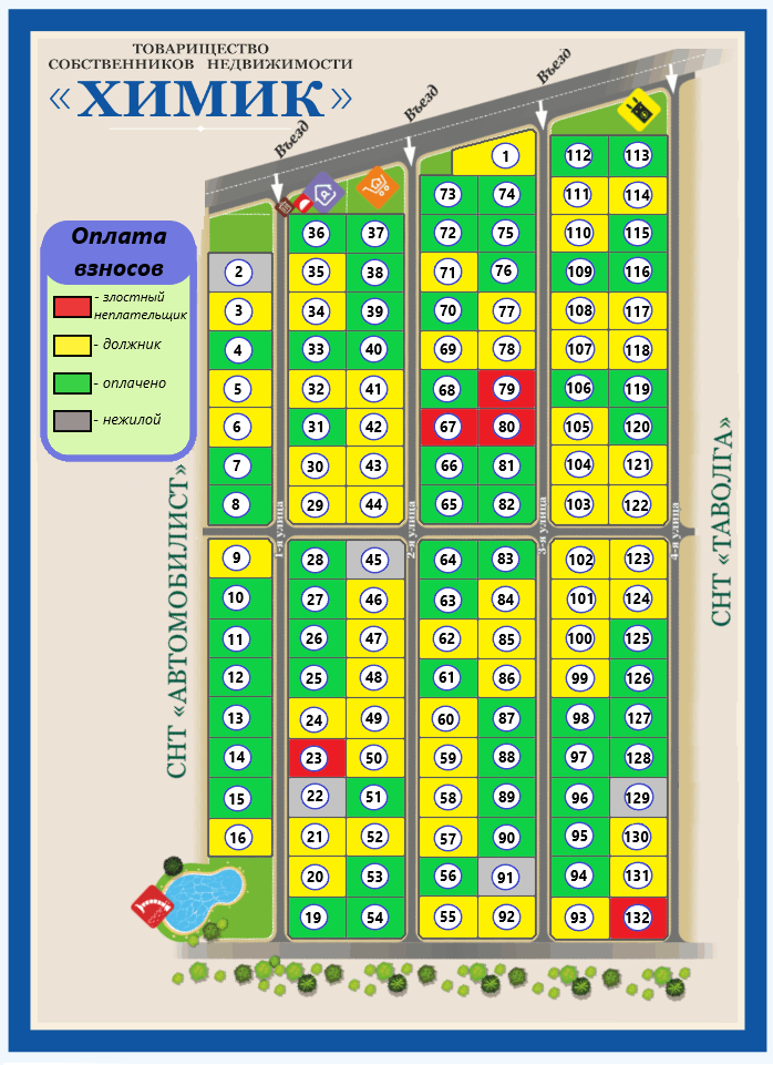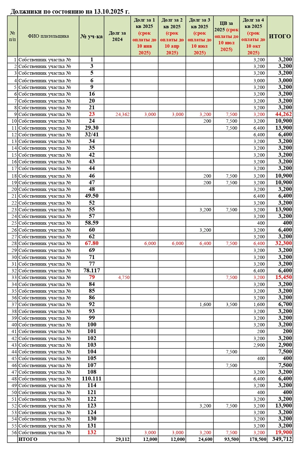 По состоянию на 13.10.2025 г. в Товариществе имеются должники по уплате членских и целевых взносов (на карте должников обозначены желтым цветом), а также злостные неплательщики взносов, которые регулярно оплачивают с большим опозданием или не платят совсем (на карте должников обозначены красным цветом). Таблица с суммами ниже.